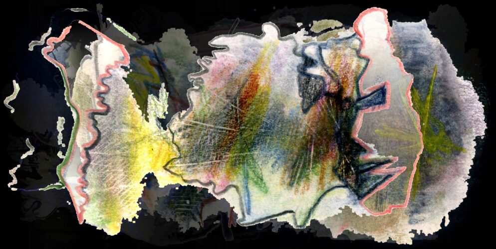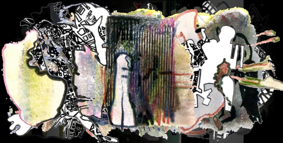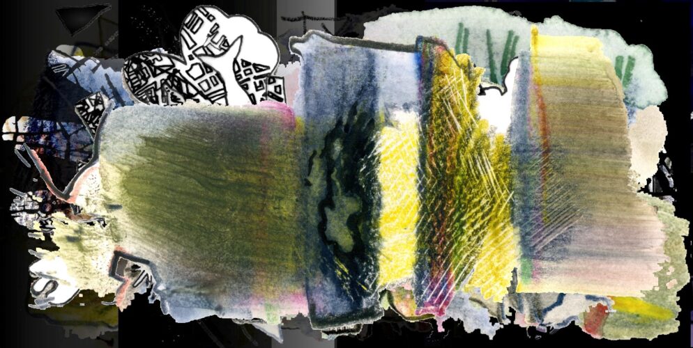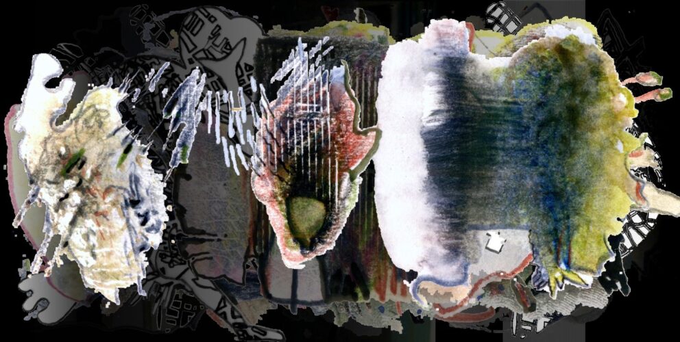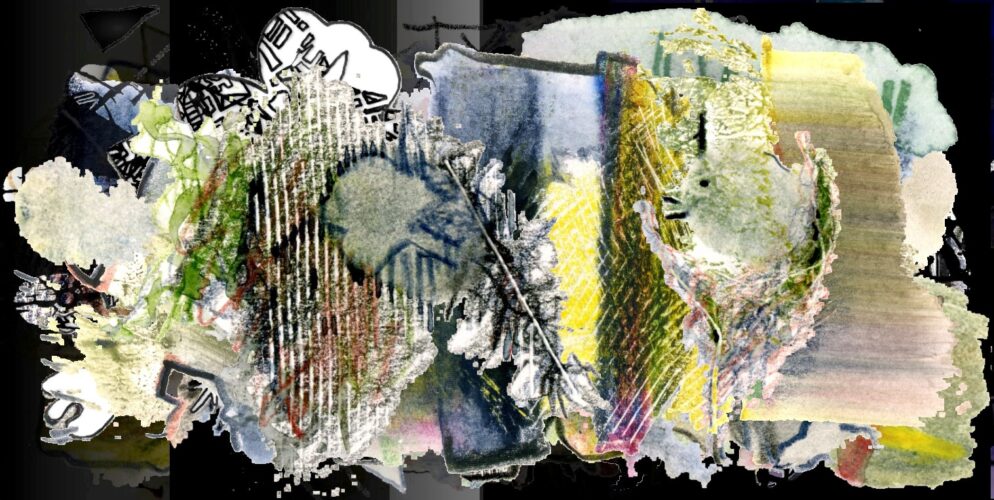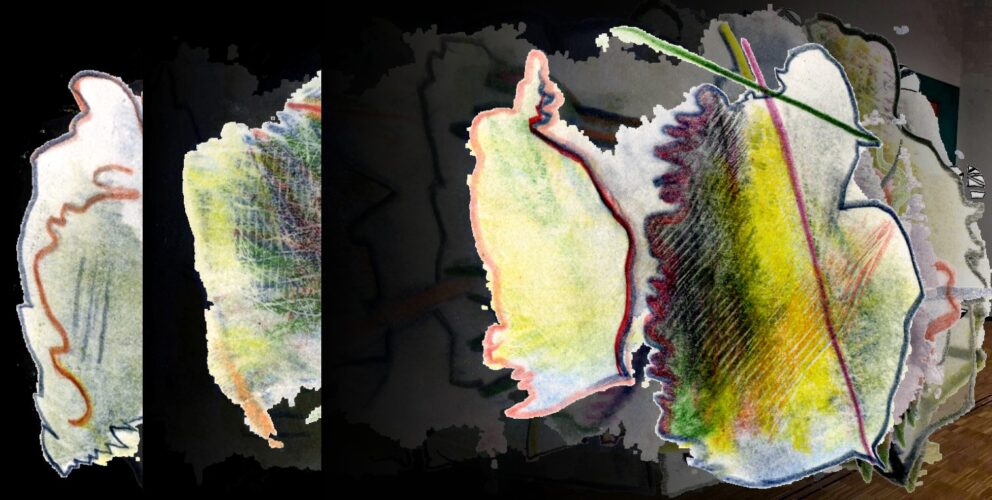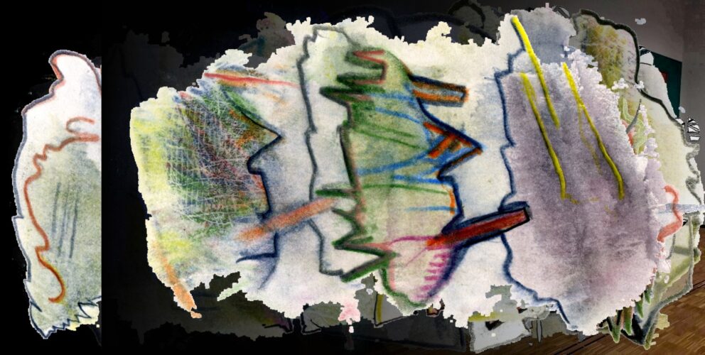 Die Umrisse der Leerstellen zwischen den dichten Linienbündeln am vorläufigen Ende der Tabosequenz, vom Mai dieses Jahres, nahm ich wieder auf. Ich zeichnete sie auf Rolle 11 einmal in Richtung des Zeitstrahles und einmal, oben drüber, in Gegenrichtung, dass eine Zeitkontinuität in diesem Fall von vornherein aufgehoben ist.