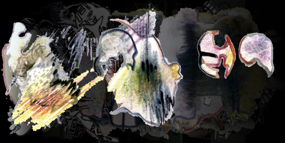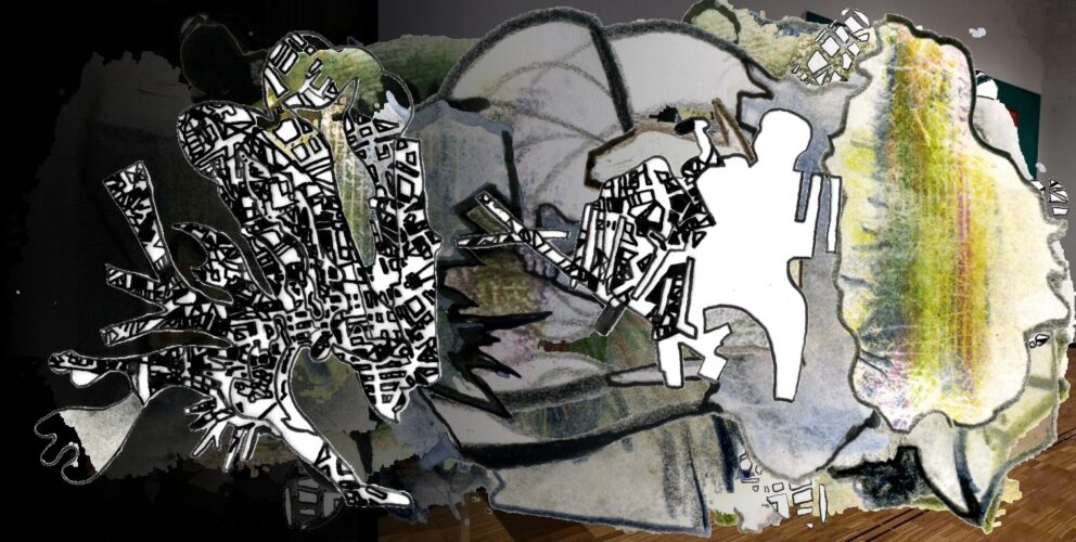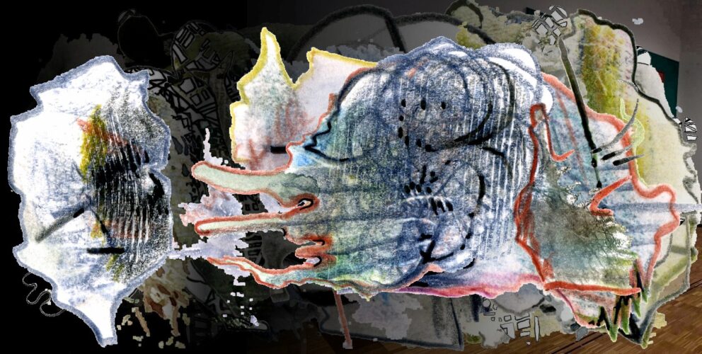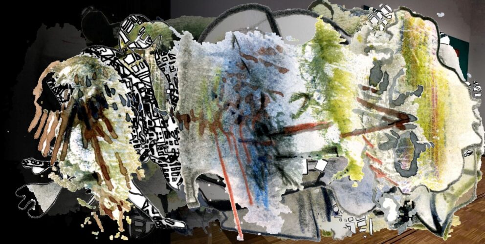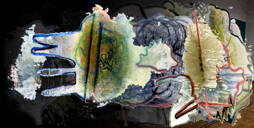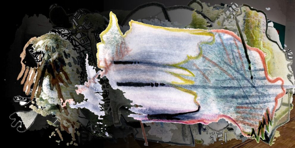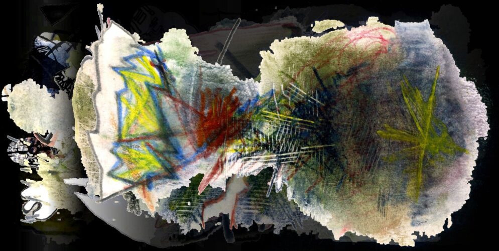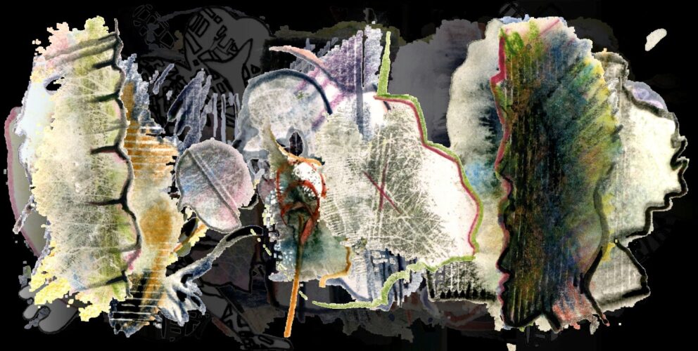 Die Umrisse der Leerstellen zwischen den dichten Linienbündeln am vorläufigen Ende der Tabosequenz, vom Mai dieses Jahres, nahm ich wieder auf. Ich zeichnete sie auf Rolle 11 einmal in Richtung des Zeitstrahles und einmal, oben drüber, in Gegenrichtung, dass eine Zeitkontinuität in diesem Fall von vornherein aufgehoben ist.