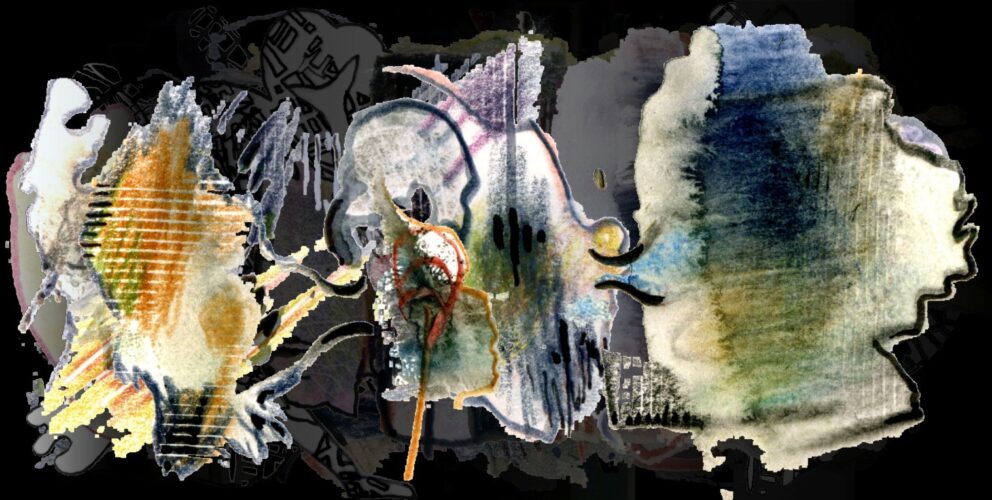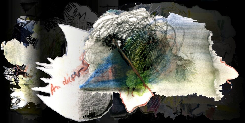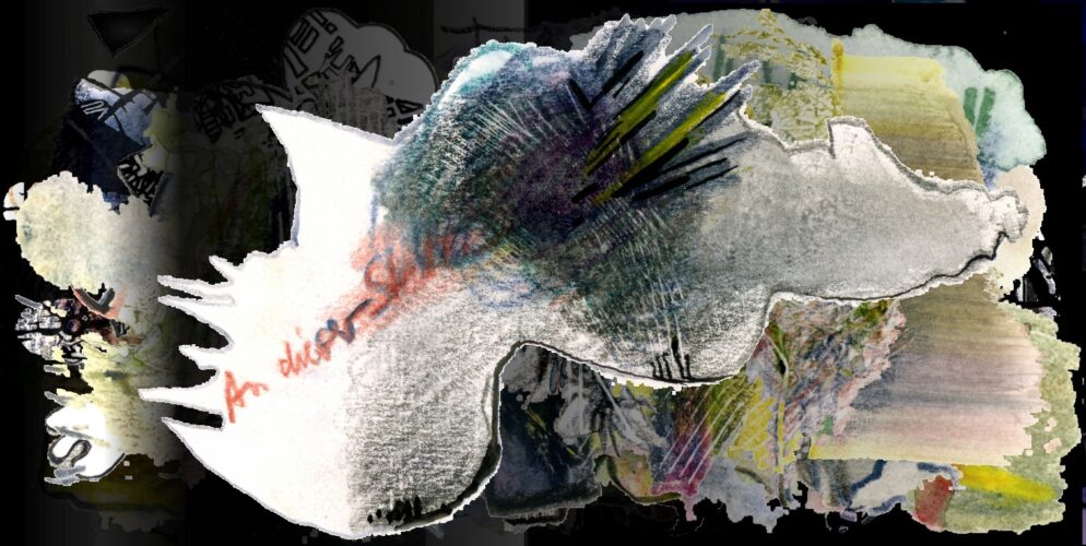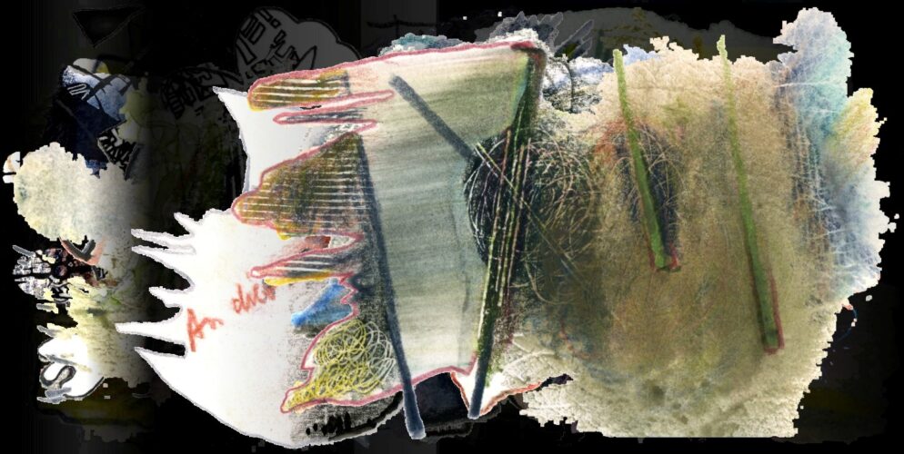 Mit einem weißen Bogen Papier, den ich mit einrollte, reduzierte ich das durchscheinende, vorgelagerte Material auf den handschriftlichen Text, den ich auf die Tabolinienzeilen geschrieben habe. Da ich ihn auf der Hinterseite der Rolle in die Umrisse durchzeichne, beschäftige ich mich mit meiner seitenverkehrten Handschrift. Ich brenne darauf, das alles schnell zu verdichten, damit ich bald neue kraftvolle Figurationen zur Hand habe.