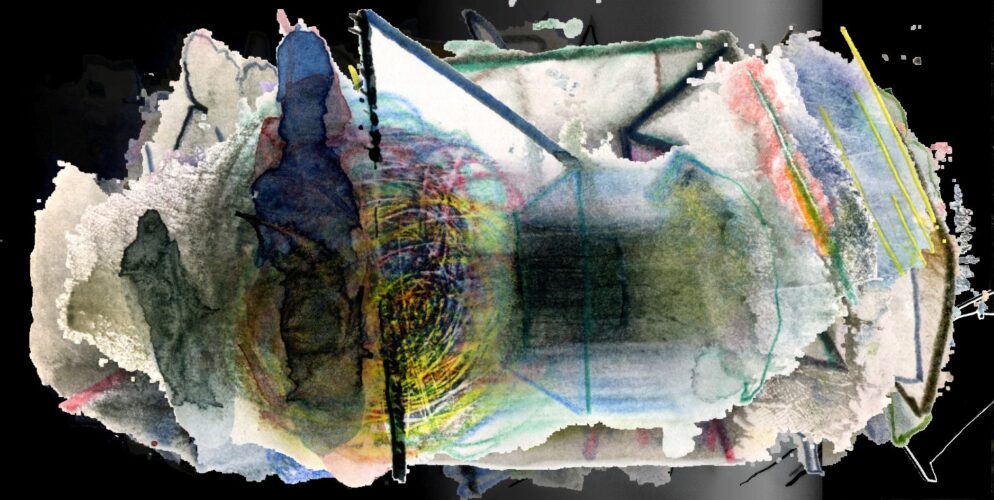 Immer mal spielen neue Elemente in den Buchmalereien eine vorübergehende Rolle. Die Haarstruktur ist bisher noch nicht mit Schrift zusammen gekommen. Wohl aber die kreisenden Linien mit Kulissenkonstruktionen. Die überraschendsten Strukturen bilden die Handkantenabdrücke, die ich manchmal mit einem erfreuten Laut kommentiere, sobald ich die Hand vom Papier entferne.