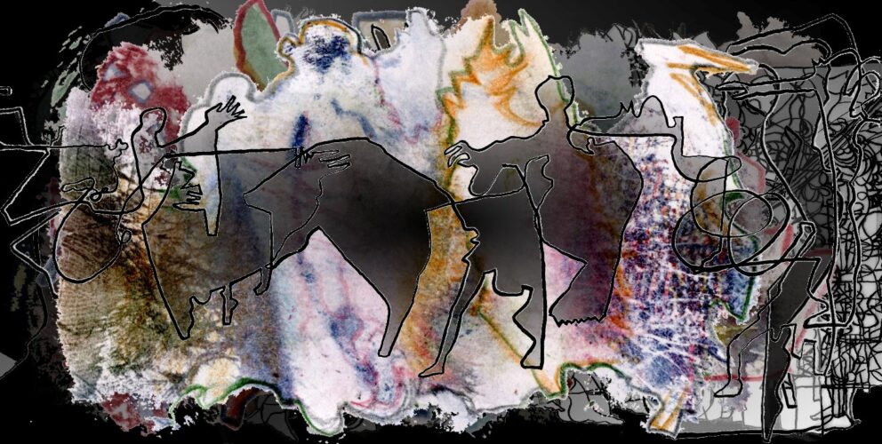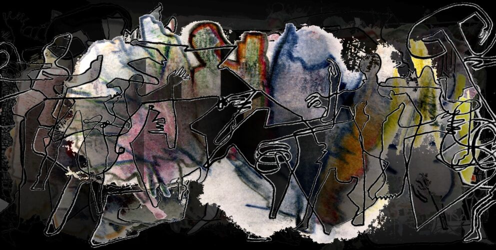 Diese Arbeitsschritte nehmen mich ganz ein. Nun bin ich gespannt, wie sich die entstandenen Szenen-Linien-Überlagerungen in die neuen Collagen einfügen werden, ob es noch einmal eine Steigerung gibt. Die Zwischenergebnisse der Versuchsreihen wiegen schwer für mich und absorbieren meine Aufmerksamkeit.