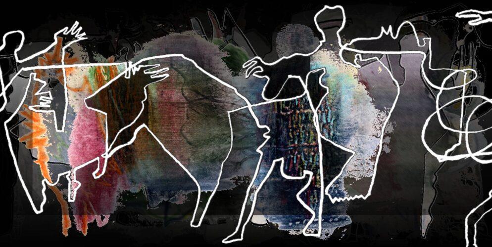 Hauptsächlich aber arbeitete ich gestern weiter an der Undertainment-Tanz-Linie auf Rolle 11. Unbeeinflusst von den Verdichtungen der Tanzsequenz zuvor, begann ich die durchgezeichnete Linie zusammenzurollen. Indem ich in die unteren Schichten der Rolle weiße Blätter einlegte, konnte das vorausgehende Liniengeflecht, das ich in den letzten Wochen gezeichnet habe, abgedeckt werden. Schon die pure Linie, ohne Überlagerungen, verhalf den letzten Collagen zu markanten Szenen, die von den Strukturen der Buchmalereien bereichert wurden. Sie fungieren wie Kostüm und Bühnenbild in abstrakter Form.