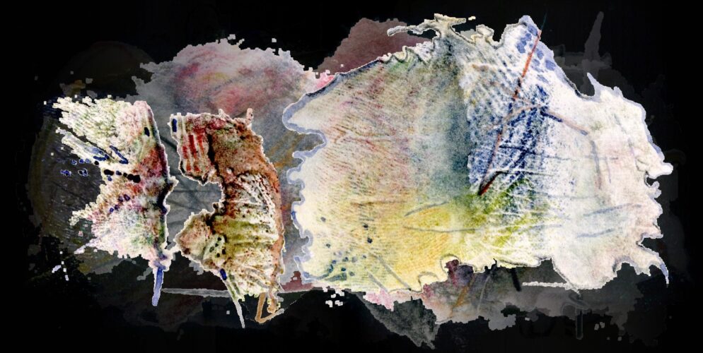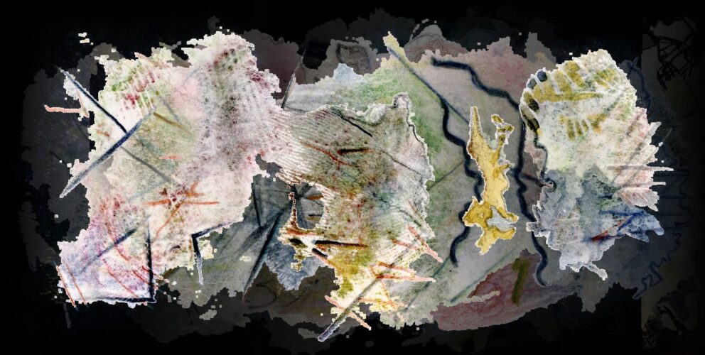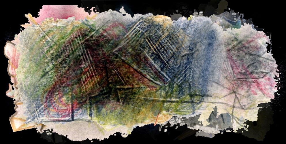 Bei der Suche nach Ähnlichkeiten werde ich auch beim Liniengeflecht des Kraftfeldes fündig. Dieses mit eigenen Geschichten aufgeladene Material zeigt Areale, die den Kompositionen aus Tabo gleichen. Die Vorgänge in mir, die sich parallel zur Durchdringung der verschiedenen Schichten manifestieren, will ich genauer beobachten. Heute war das blitzartige Springen des Blicks von einer zur anderen Ebene ein solches Phänomen.