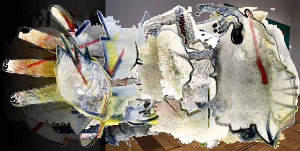 Zunächst benötige ich einen Überblick über das Textmaterial, das ich dem Humboldt Forum für die Ausstellung „Hin und weg“ und für das Stück „Bau auf! Bau ab!“ zur Verfügung gestellt habe. Seine Verbindung mit dem Stadtraum, der von der Umrisslinie der rechten Hand definiert ist, bildet meinen Part eines Experimentalaufbaus, der noch weitere Schichten mit einschließt, die von anderen Menschen mit anderen Professionen beigesteuert werden können.