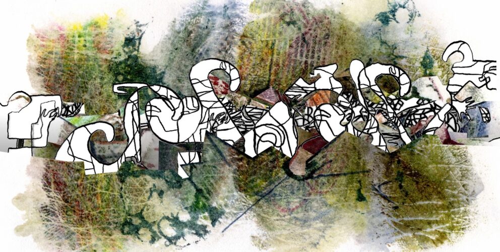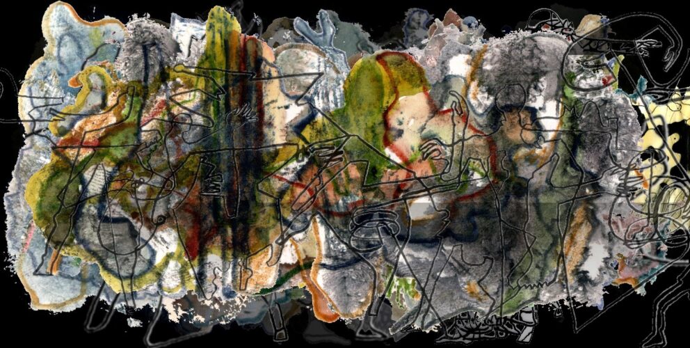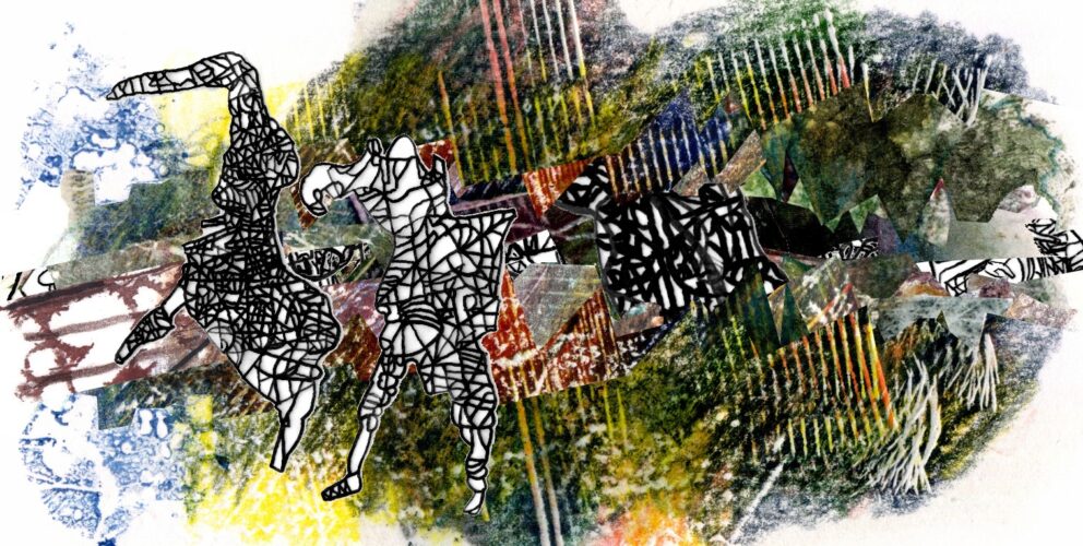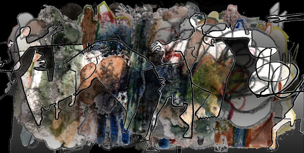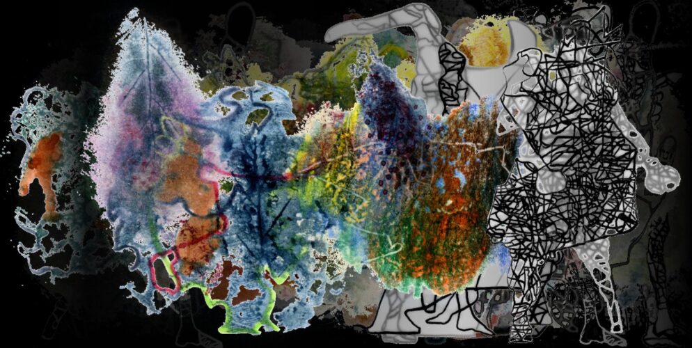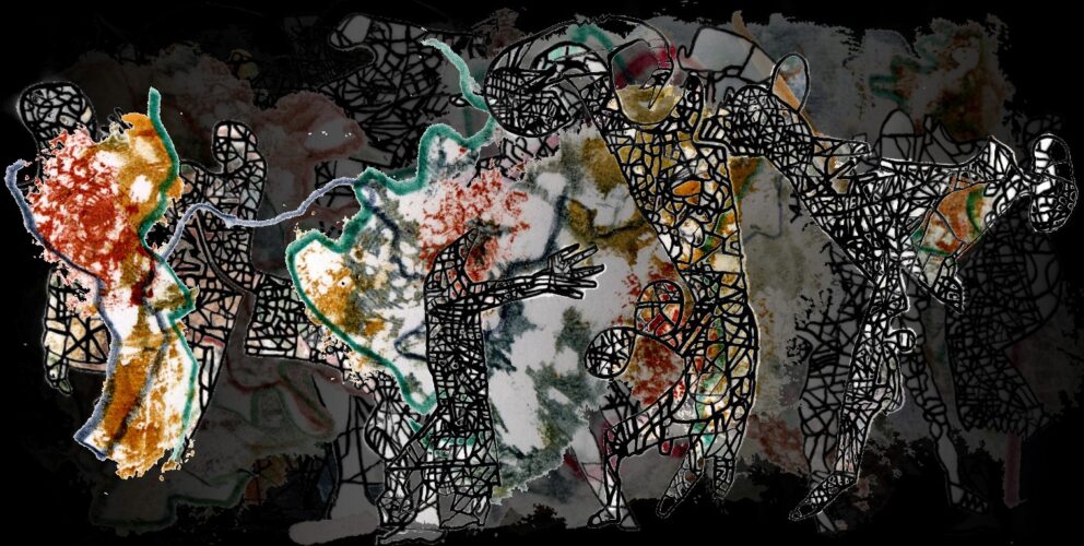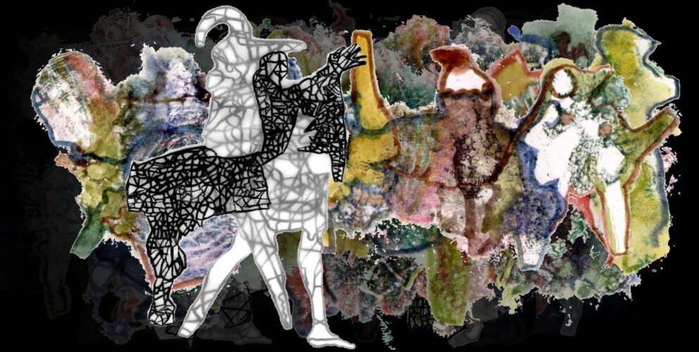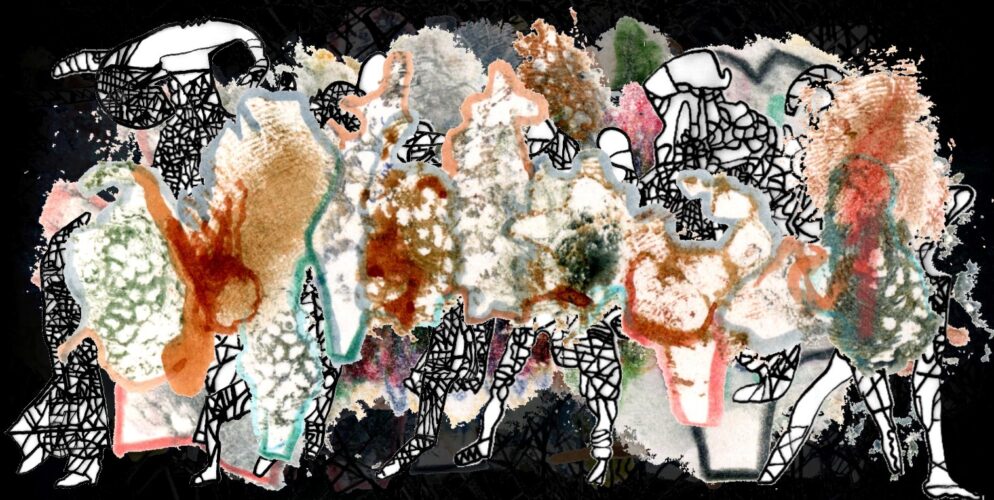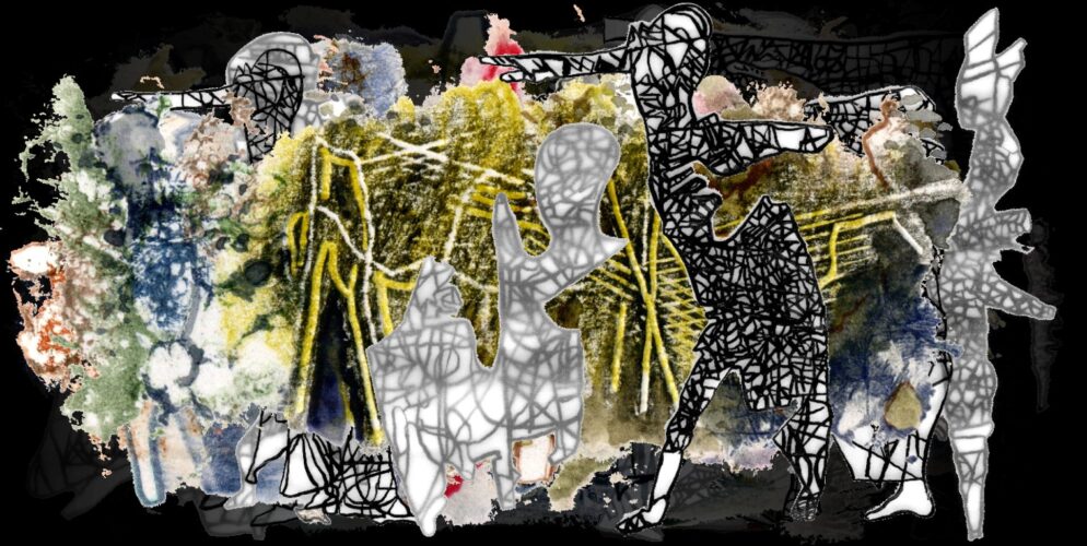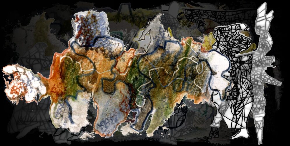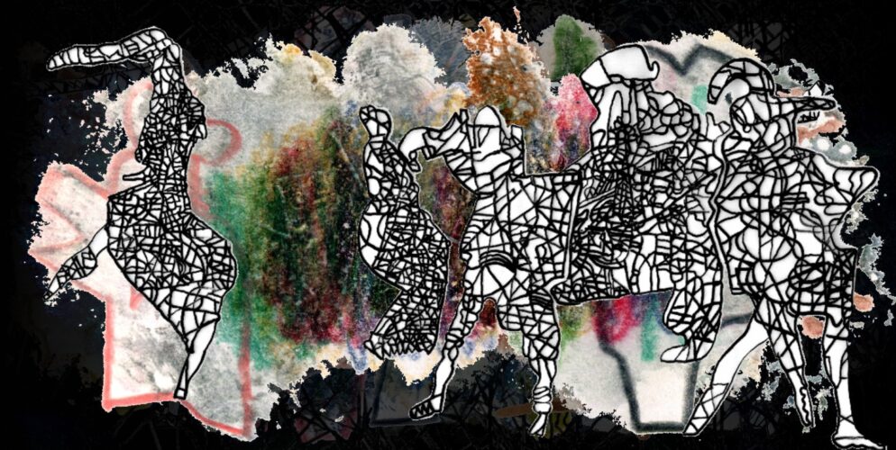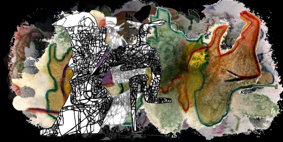 Diagonal über die Wiese des Gustavsburgplatzes, zum Stamm der Vaganteneiche hin, bildet sich ein Pfad, den ich fast täglich viermal begehe, um dem Baum zuzuhören. Manchmal spricht er schon im Näherkommen, und gleich bei der Ankunft kann das aktuelle Wort aufgeschrieben werden. Bei Ursula Krechel las ich gestern von den Lautmalereien die Kurt Schwitter in einem englischen Internierungslager schrieb. Die Worte des Baumes wären auch beziehungsreiche Sockelgestaltungen für die Tanzfiguren.