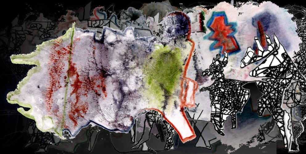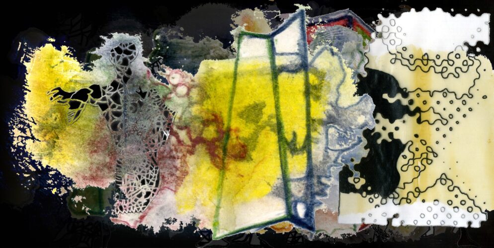 Bei den Konturlinien, die ich um die Abdrücke herumzeichnete, dachte ich schon an die hellen Farbstrukturen, die in den täglichen Collagen aus der digitalen Dunkelheit herausstrahlen werden. Und heute kommen auch wieder die Linienüberlagerungen von Rolle 11 dazu. Wie wäre es, die geschichteten Bildentwicklungen in einer Animation aneinander zu hängen?