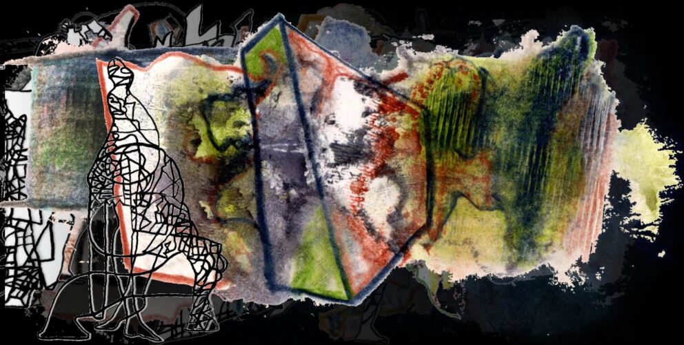 Der Abdruck eines hellen, ovalen Lavakiesels, krakelige Papiergravuren, die durch eine Farbstiftschicht aus Suchlinien sichtbar wurden, bildeten den Beginn des Bildertages. Ich vertiefte mich in die kleinen Areale, um vielschichtige, transparente Absichten zu erzeugen, die beim näheren Hinsehen neue Welten zur Entdeckung preisgeben.