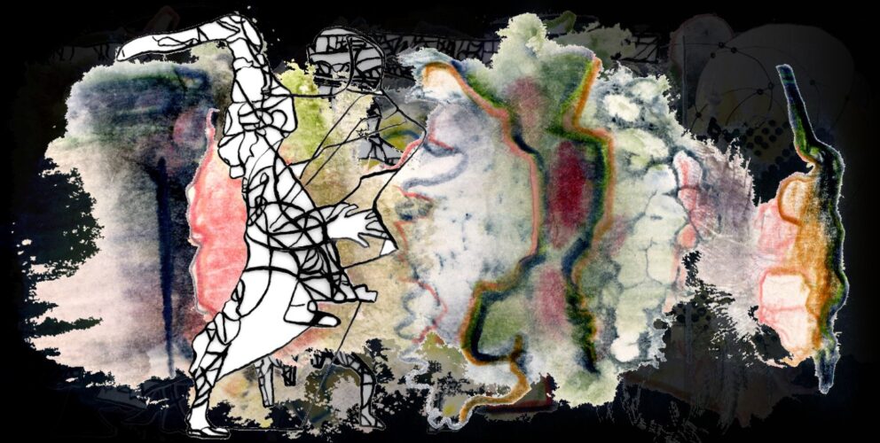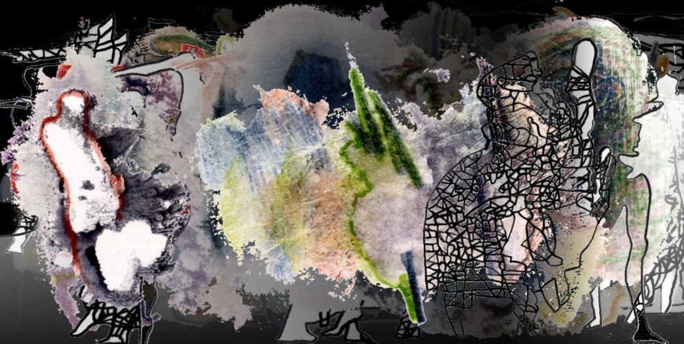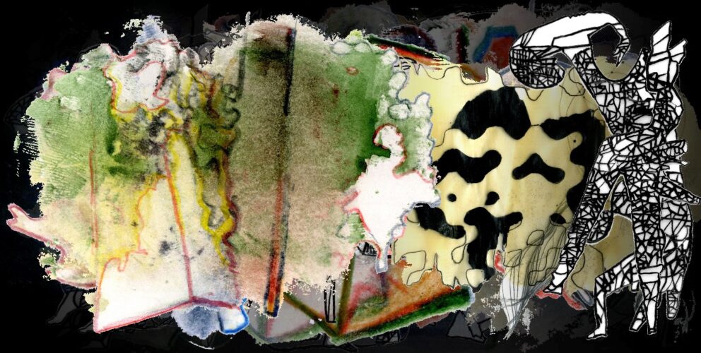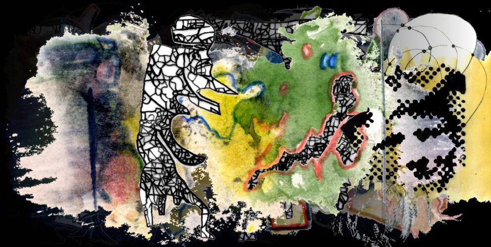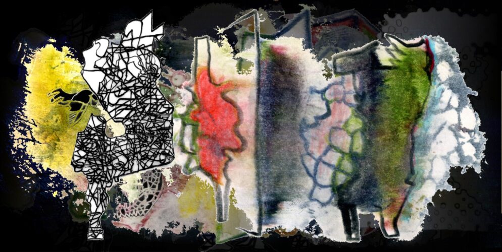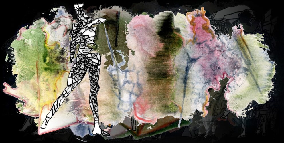 Verschiedene Ebenen der Werktagscollagen bilden zurzeit Dialogräume zwischen dem Tanzpersonal der Transparentpapierrolle aus Tuschelinien und den Umrisswesen, die sich in den Strukturen der Buchmalereien manifestieren. Eine Szenerie von hintereinander hängenden Projektionen und realen Bühnenfiguren, die aufeinander reagieren.